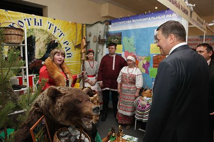 На двух этажах «Русского дома» разместились экспозиции городских округов и районов, а также продукция предприятий, выпускаемая под маркой «Настоящий Вологодский продукт».