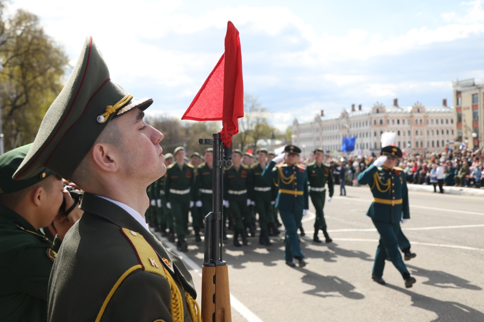 Торжественный митинг начался с выноса копии Знамени Победы - штурмового флага 150-й ордена Кутузова II степени Идрицкой стрелковой дивизии, который 1 мая 1945 года был водружен над Рейхстагом в Берлине.