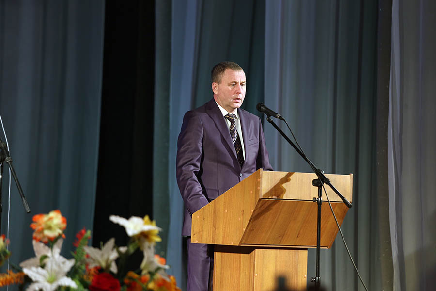 После приглашения ведущих на сцену выходит глава района Михаил Лупандин. "Начался самый главный праздник в нашем районе, на котором мы чествуем человека труда", - открыл официальную часть праздника глава района.