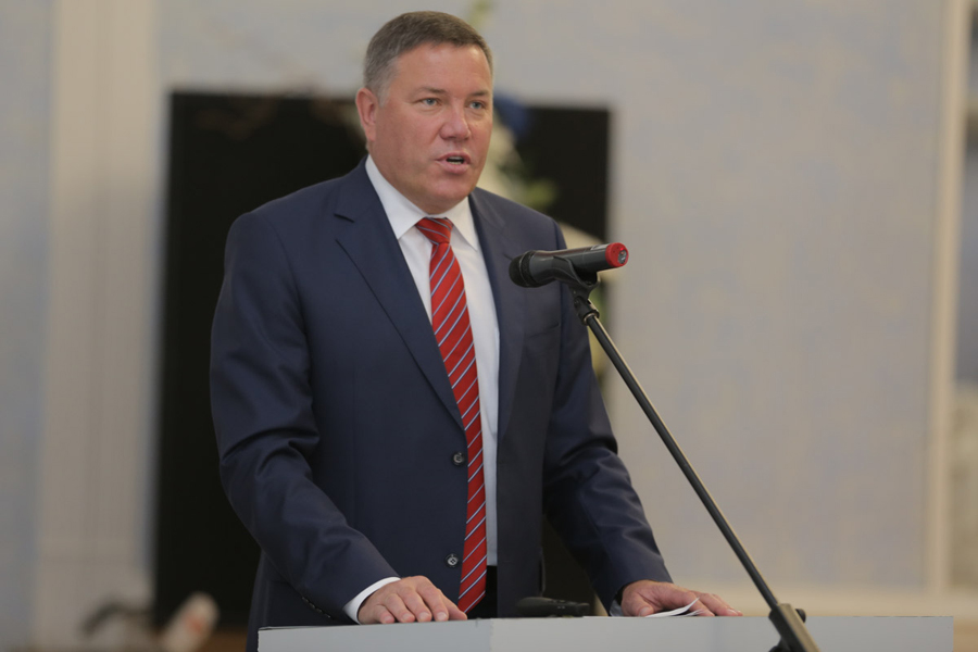 Теперь слово взял губернатор Вологодчины Олег Кувшинников. Глава региона рассказывает о развитии экономики области, о достигнутых за несколько последних лет результатах. Тут, напомним, регионы действительно есть чем гордиться. Олег Кувшинников отметил, что в прошлом году в области были достигнуты исторические рекорды по производству чугуна, минеральных удобрений. И теперь каждая шестая тонна российского чугуна, маталлопроката, каждая восьмая тонна сложных минеральных удобрений, а также каждый второй подшипник и каждый третий российский трактор произведен на Вологодчине. Владимира Боглаева отметил и губернатор. Руководитель ЧЛМЗ получил из рук главы области Почетную грамоту.